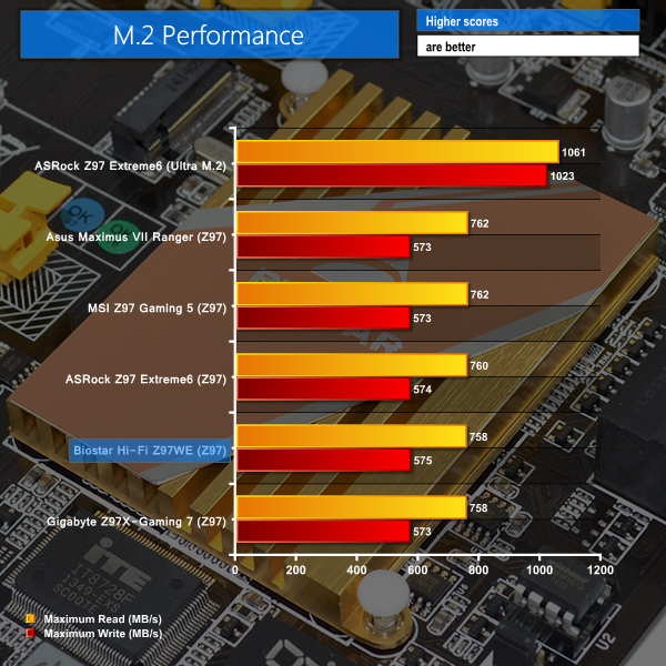 Plextor's PCIe-fed M.2 SSD performed to its usual standard through Biostar's chipset-fed connector. SATA-based M.2 devices also function correctly, as proven by our testing with such a device from Kingston.