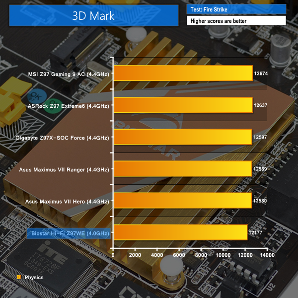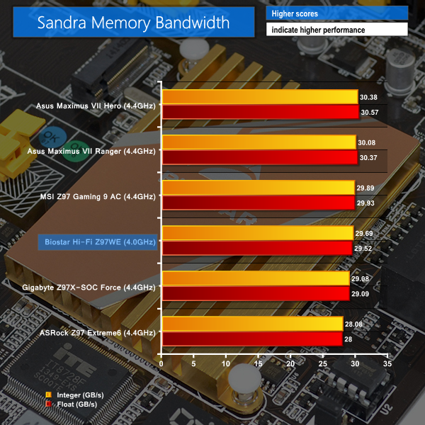 Biostar's Hi-Fi Z97WE struggles to make a positive impression in system benchmarks that leverage CPU power. With a 4-core clock speed 200MHz lower than the competing boards which all use a 4.4GHz MCT setting by default, Biostar's board is left sitting in last place in our 3DMark and Sandra processor arithmetic benchmarks.