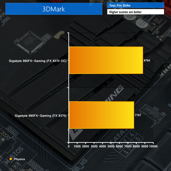 The Physics score in 3DMark shows a positive correlation with increased system frequency. Using Gigabyte's motherboard to overclock the system yields a points boost of more than 1000.