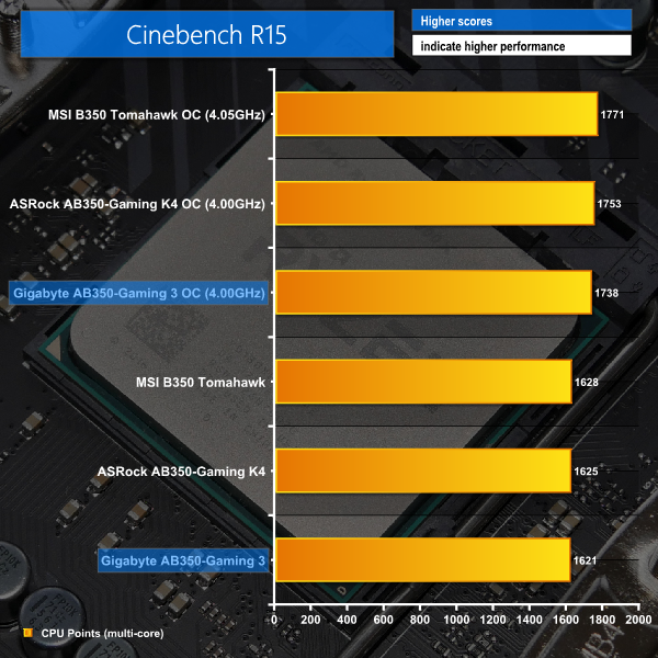 Limited overclocking capacity, compared to MSI's B350 Tomahawk, hurts the performance of Gigabyte's AB350-Gaming 3 in Cinebench.