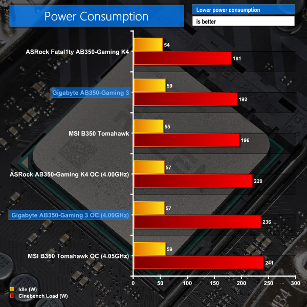 We leave the system to idle on the Windows 10 desktop for 5 minutes before taking a reading. For CPU load results we run Cinebench multi-core and take a reading. The power consumption of our entire test system (at the wall) is shown in the chart.