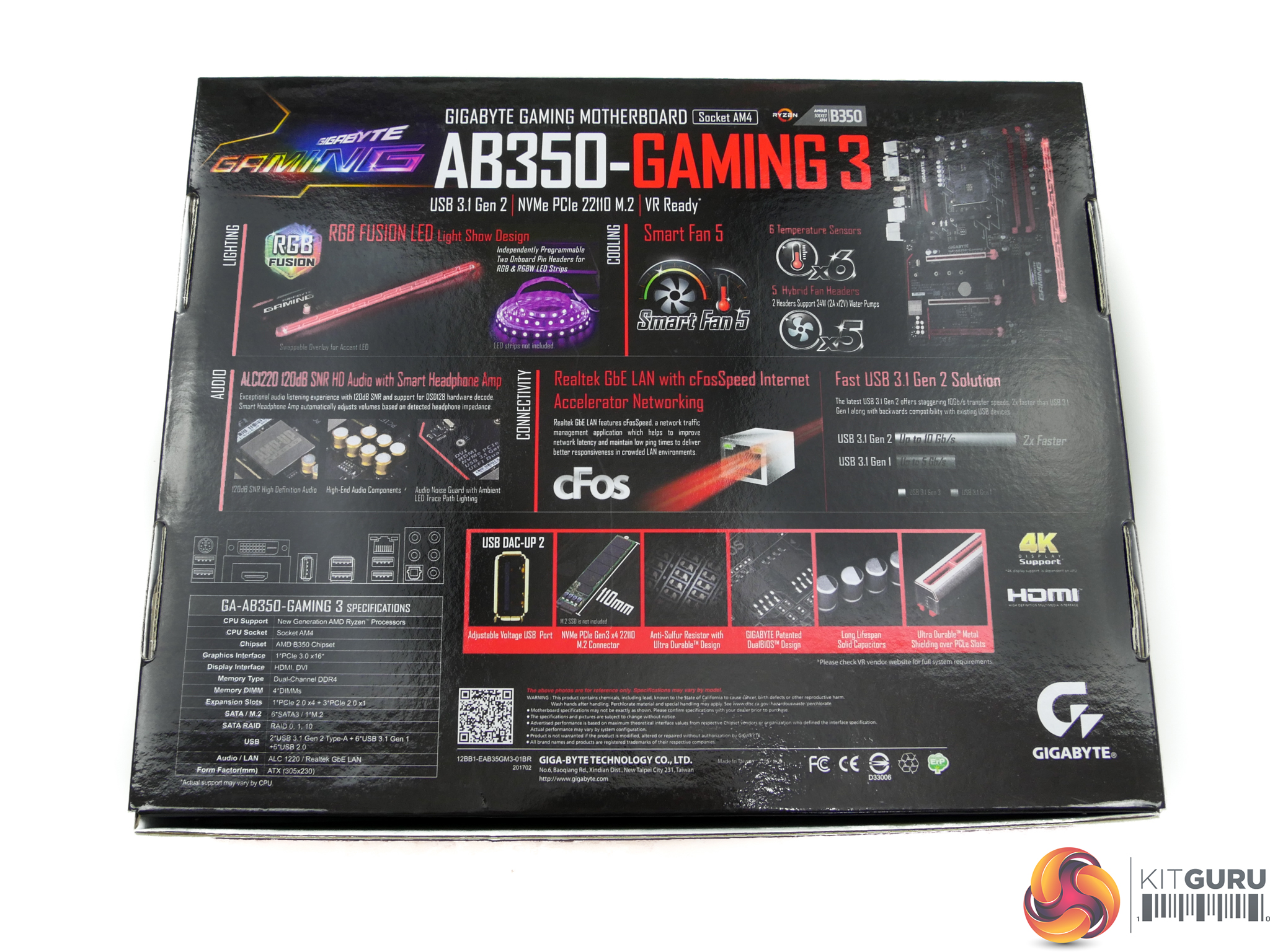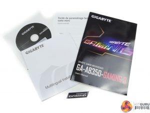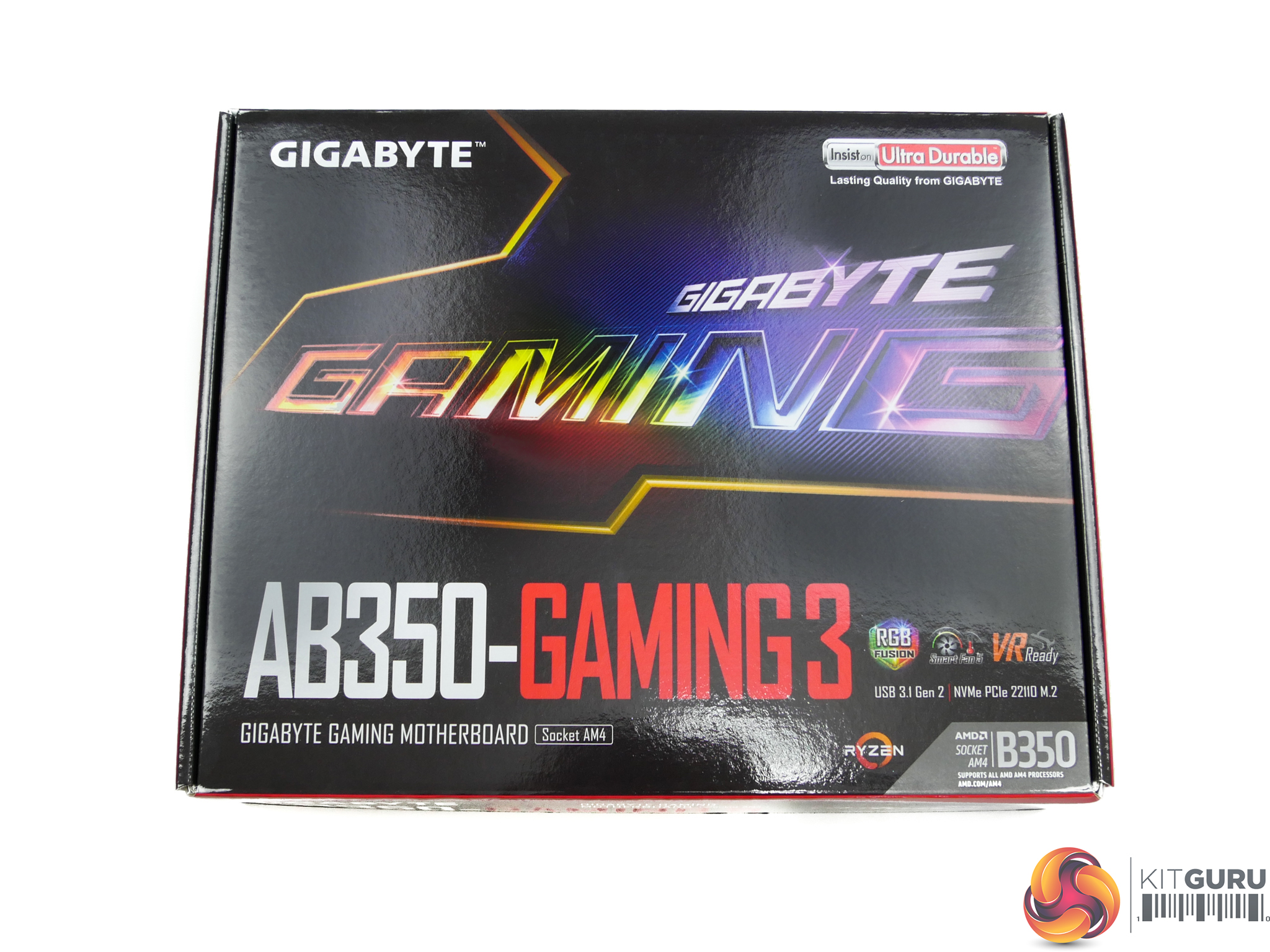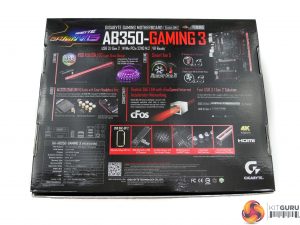 The Gigabyte AB350-Gaming 3 ships in shiny black packaging with segments of colour. Specifications and features are outlined on the rear.