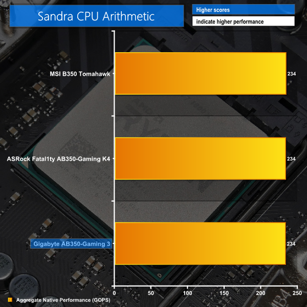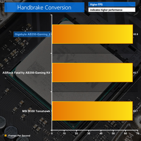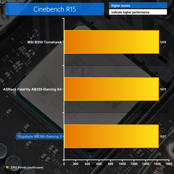 No issues with Gigabyte's AB350-Gaming 3 when it comes to CPU-heavy performance. The performance is almost identical to that of ASRock and MSI competitors.