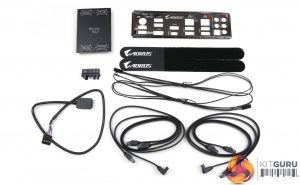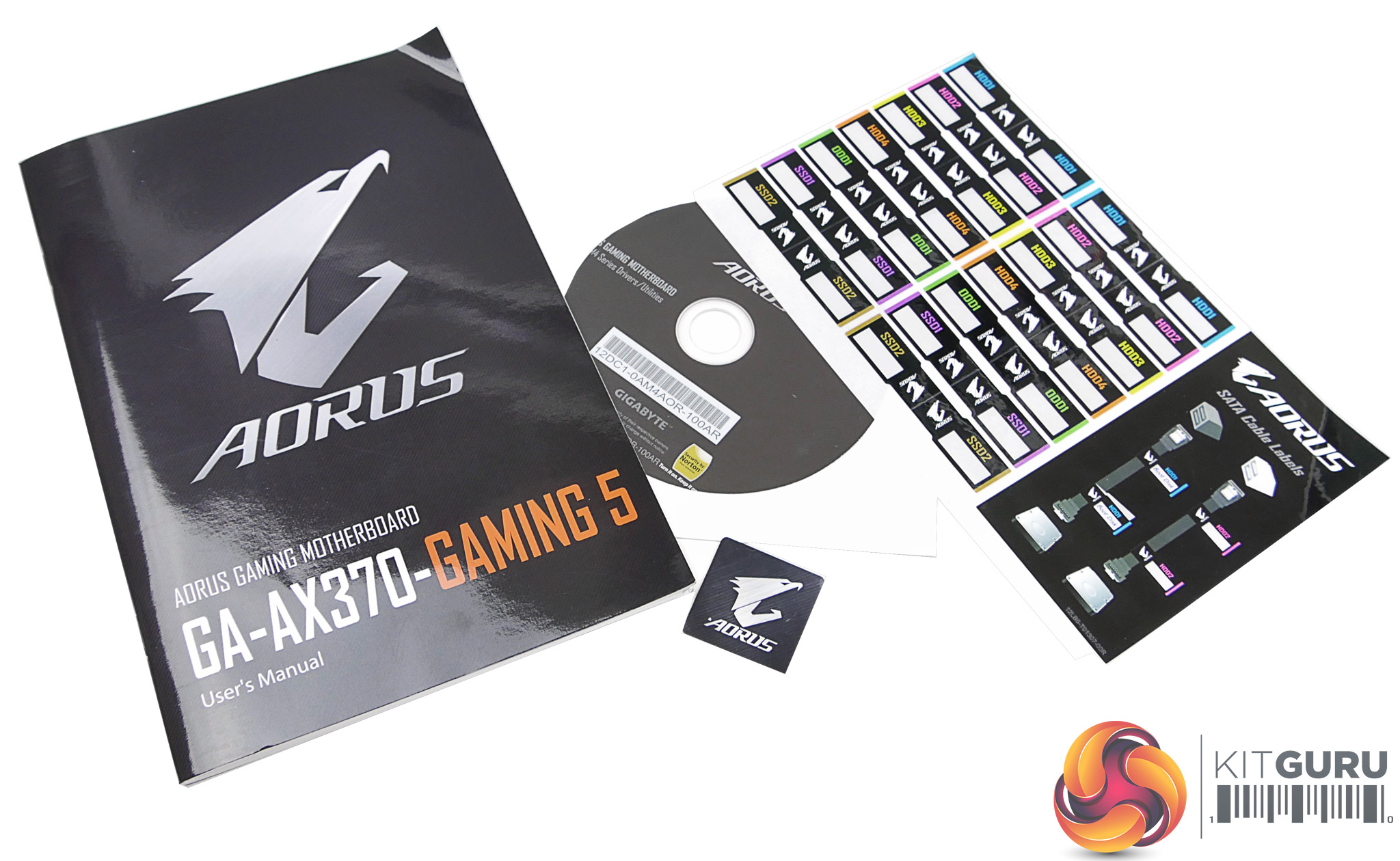 The usual documentation is accompanied by an Aorus case sticker and a set of cable labels.
