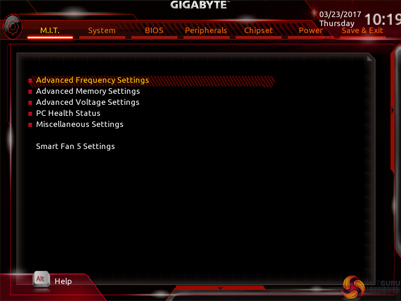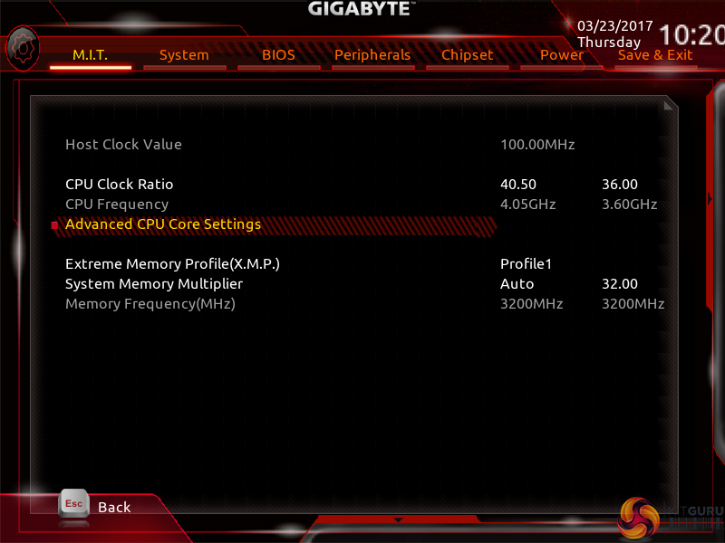 M.I.T. is the main section where parameters relating to voltages, frequencies, and power settings for the system’s main components are found. The Memory and Voltage sections are split from the Frequency subsection, which makes sense until one realises that an entire group of memory settings is replicated in both the Frequency and Memory subsections.