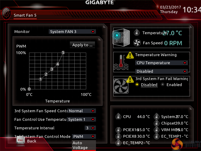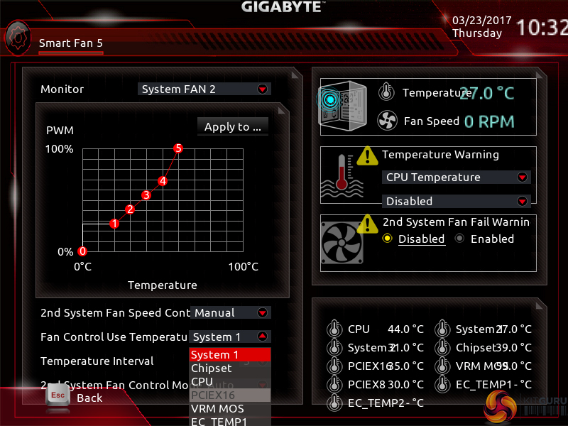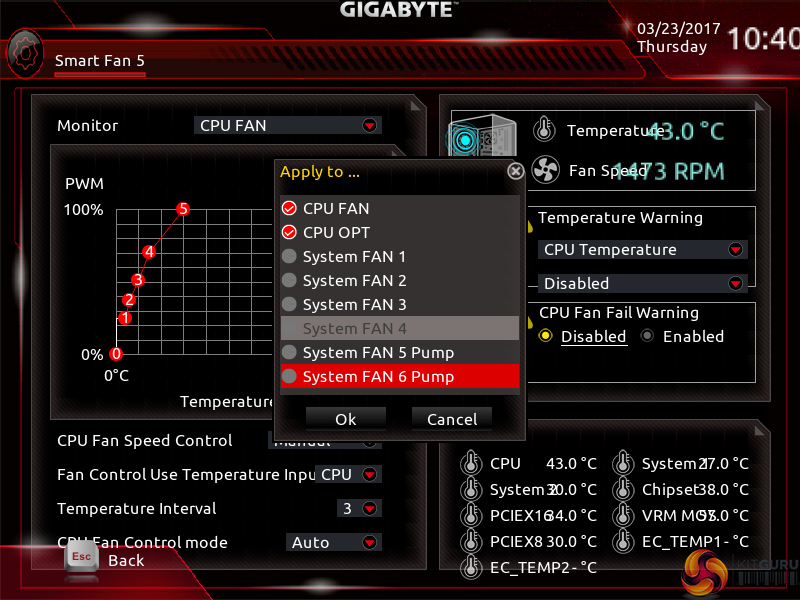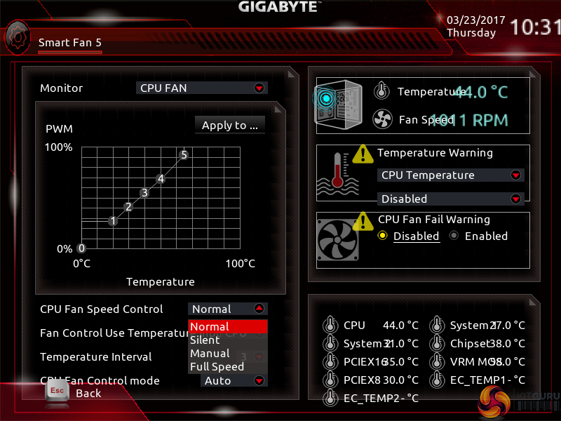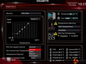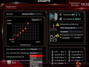 All fan headers can be individually selected and their speed profiles can be tweaked. Gigabyte includes several preset fan speed control settings and a choice of temperature monitoring points. The headers can also be set to PWM or Voltage (DC) mode at will, which is ideal for feeding continuous current to a watercooling pump or letting PWM fans adjust their own speed.