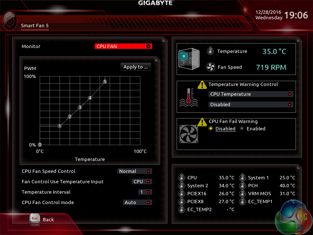 All fan headers can be individually selected and their speed profiles can be tweaked. Gigabyte includes a number of preset fan speed control settings and a choice of temperature monitoring points. The headers can also be set to PWM or Voltage (DC) mode at will, which is ideal for feeding continuous current to a watercooling pump or letting PWM fans adjust in speed.
