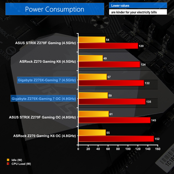 Stock (MCT) power consumption was not a strength for Gigabyte due to the over-aggressive CPU voltages being applied. Overclocking only resulted in effectively the same power consumption, emphasising just how needlessly high the stock voltage levels are.