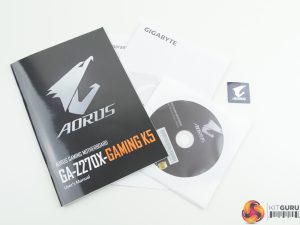 The Gigabyte Aorus Z270X-Gaming K5 ships in a black box that features the eagle branding logo on the front side and information relating to features on the rear.