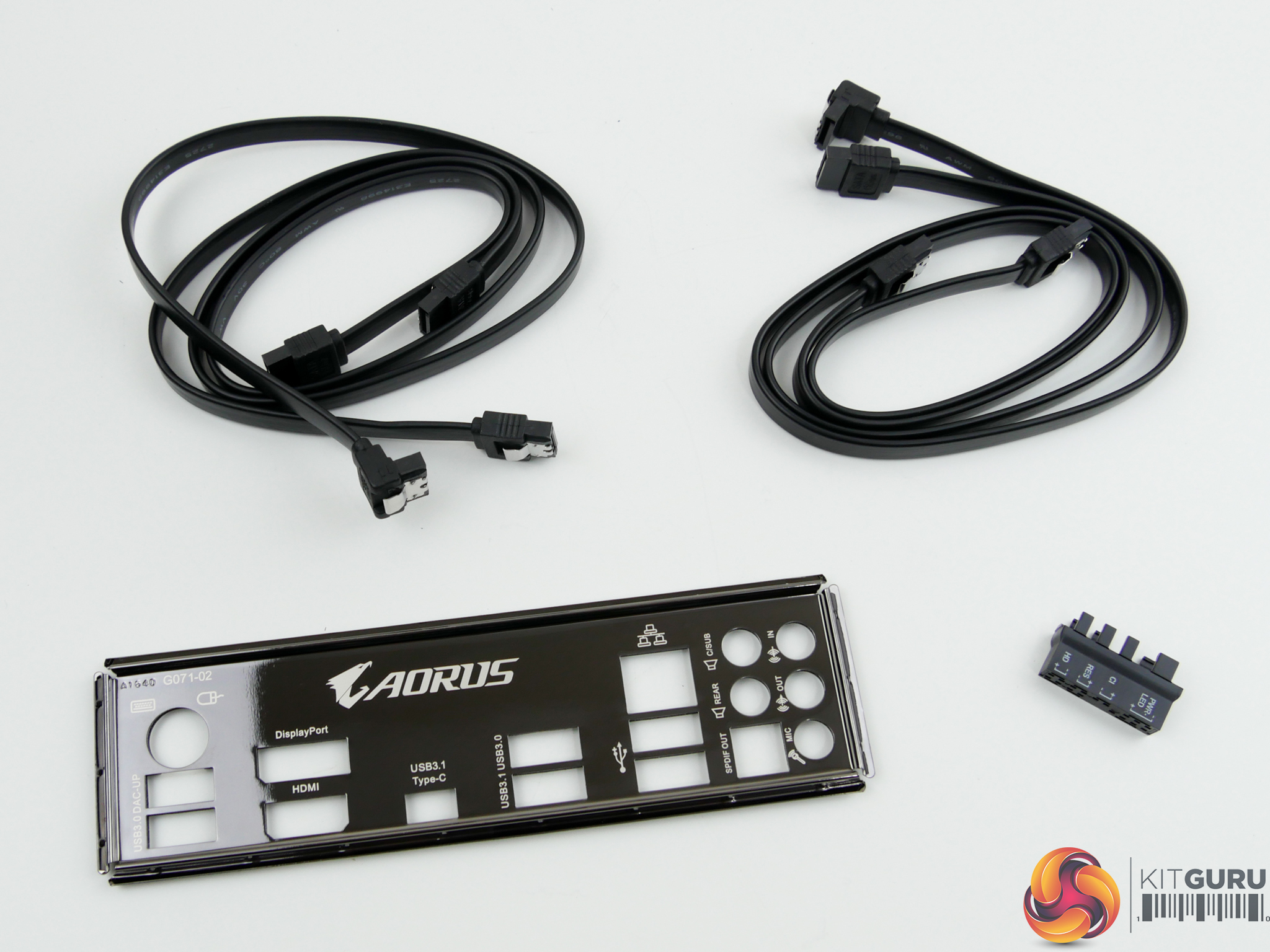 The accessory bundle consists of four SATA 6Gbps cables, the rear IO shield, and a quick connector block for front panel IO cables. An extension cable for RGB lighting strips would have been a welcomed addition to the package.