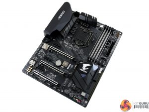Gigabyte's Ultra Durable Armor PCIe slots are clearly visible with their stainless steel reinforcement designed to minimise GPU sag or slot damage. The same shielding approach is used for the DIMM slots which helps to minimise PCB flex during installation of memory modules.