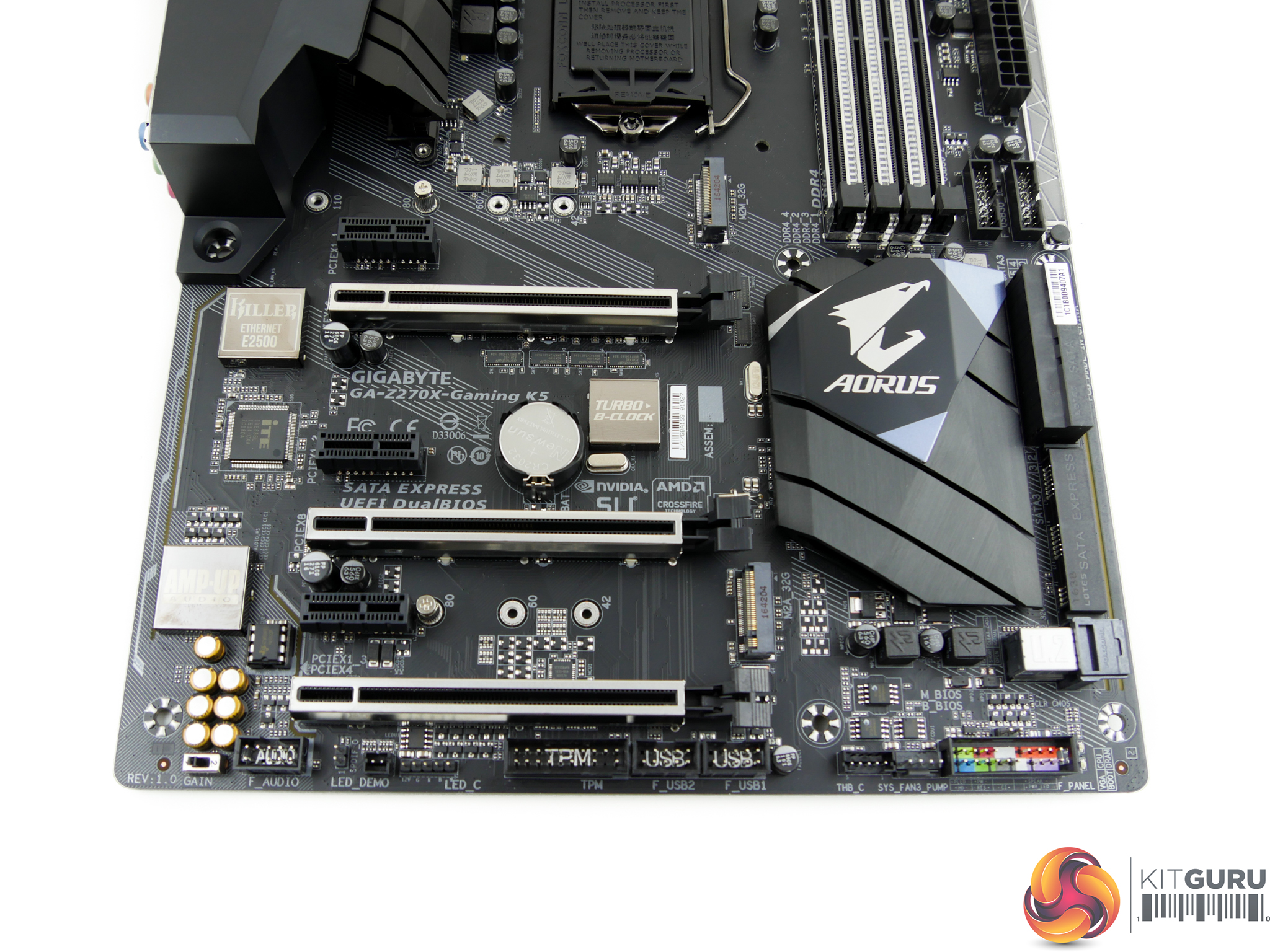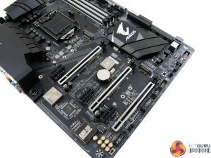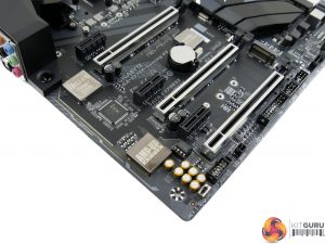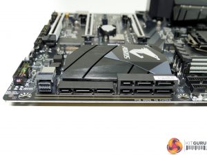 Up to 110mm-long drives can be housed in the top slot while the lower is limited to (the more common) 80mm-long variants. It is disappointing to see that Gigabyte has not given M.2 SSD cooling any consideration, as MSI has done with its M.2 Shield. With that said, positioning of the upper M.2 slot (not below a GPU) means that one could manually attach a VRM-style heatsink to an M.2 SSD without worrying about vertical interference. Incidental airflow from an air CPU cooler would also help.