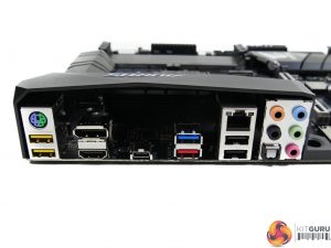 A total of six USB Type-A ports are found on the rear panel which is a fair number for most users wanting this calibre of motherboard (although another pair would have been welcomed). A PS/2 connector is mounted above the two yellow-coloured USB 3.1 Gen 1 5Gbps ports that also support Gigabyte's USB DAC-UP 2 feature to deliver cleaner power to USB headsets and audio peripherals. There's another 5Gbps USB 3.1 Gen 1 port mounted above the red, ASM2142-powered 10Gbps USB 3.1 Gen 2 Type-A port, next to the 10Gbps Type-C connector.