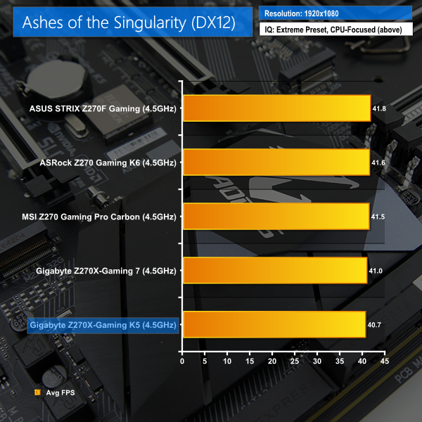 3DMark's Fire Strike test results in a decent score for the Gaming K5. However, this positivity is lessened when looking at Ashes of the Singularity and GTA V performance; the Aorus Z270X-Gaming K5 drops about 1-2% of the FPS performance in both of those titles compared to competing vendors' motherboards.