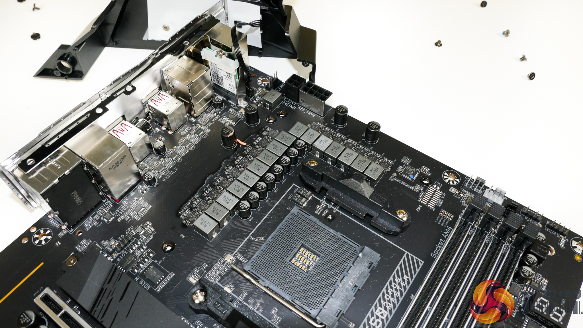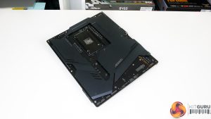 Moving around to the backside, we see a large metal backplate mounted to the 6-layer PCB. The backplate adds clear rigidity to the motherboard, aiding with mechanical load distribution when hanging a heavy CPU cooler from the socket.