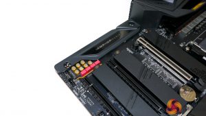 The trio of fan headers in this location is also excellent from a cable management perspective. However, I am disappointed to see a complete lack of onboard power/reset/clear CMOS buttons on a premium motherboard at this price point. Some onboard voltage monitoring points would have been welcomed, too, but they are perhaps an unnecessary luxury given the target audience.