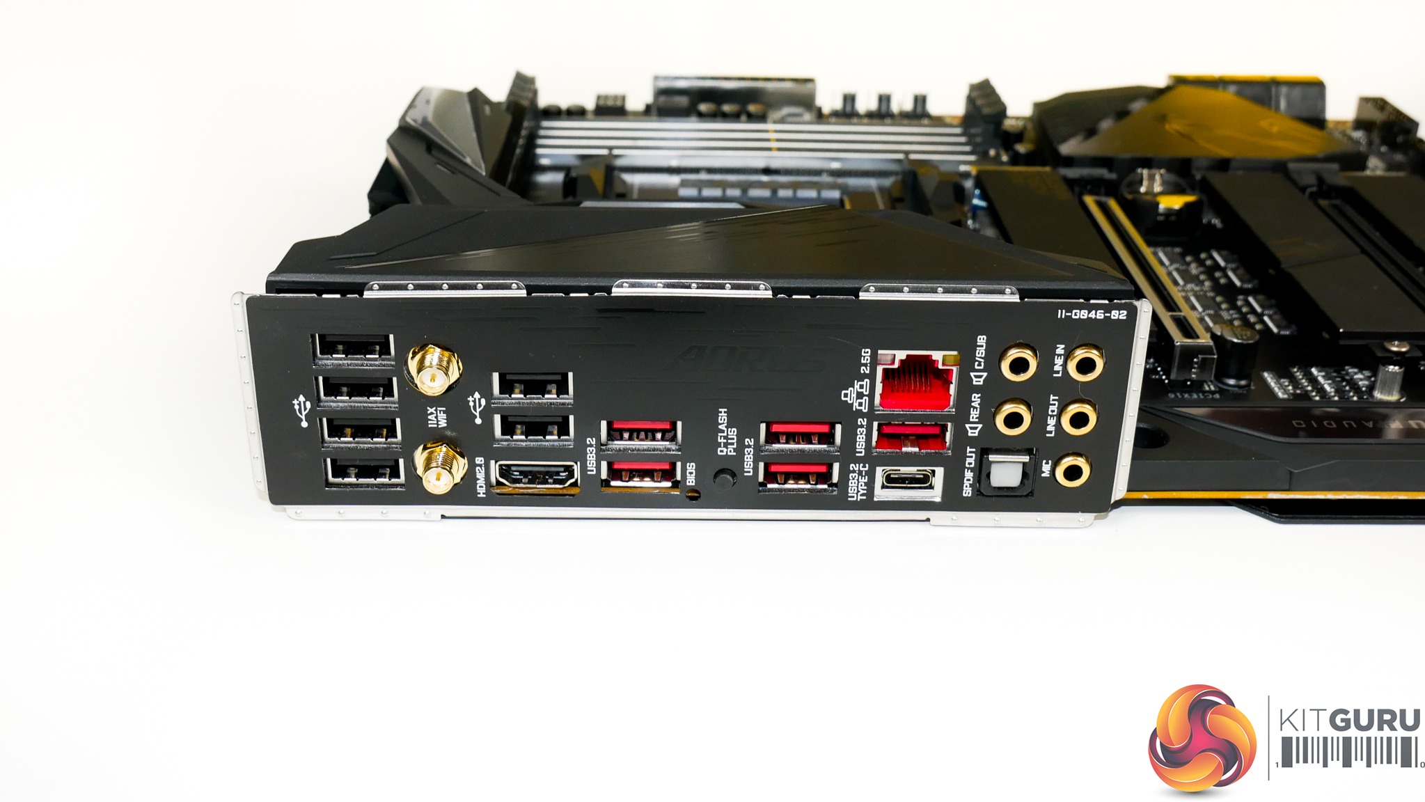 The BIOS Q-Flash Plus button and a dedicated USB port are mounted on the rear IO. Gigabyte does not provide a clear CMOS button and this is disappointing for a motherboard in this market segment.