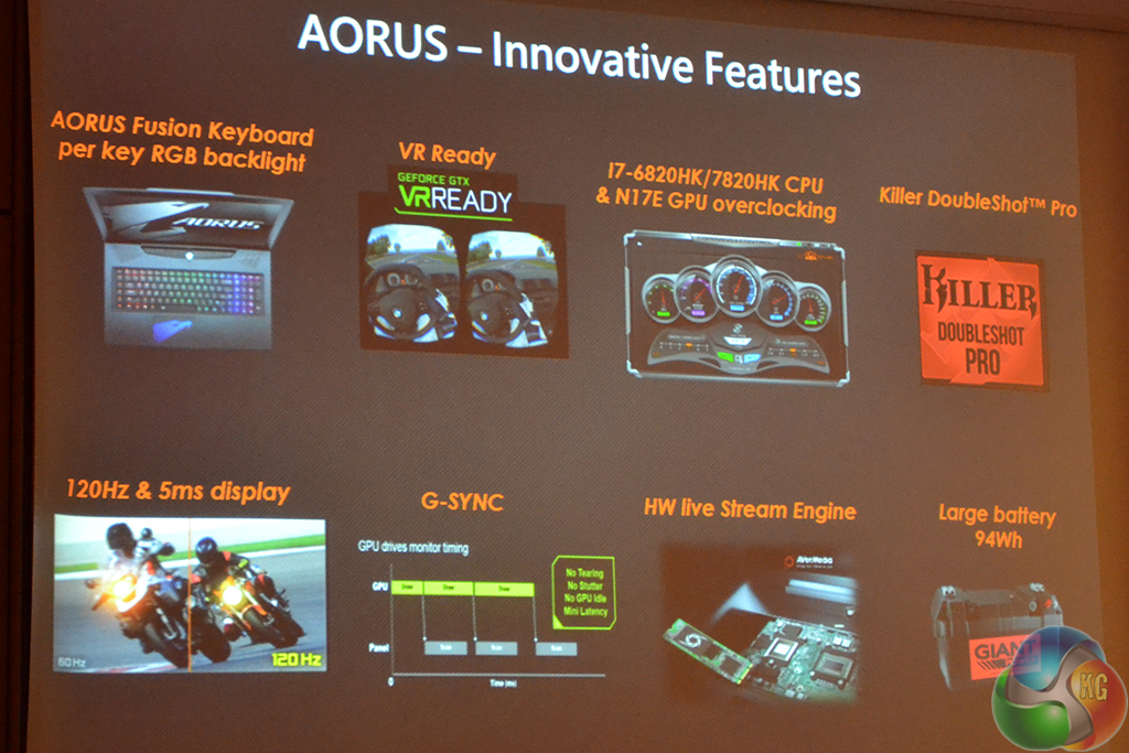 There was a presentation relating to offerings that have been associated with the Aorus brand since its inception in 2014 – notebooks. Three main models currently exist – the 14″-class X3, 15″-class X5, 17″-class and X7. Aorus' Gordon outlined how the models are designed to be slim and light because ‘mobility is important for notebooks'. The 1.8kg X3 and 2.5kg X5 fit GTX 1060 and GTX 1070, respectively, into chassis that are just 0.9″-thick. The former supports a QHD+ (3K) IGZO screen while the X5 has more gamer-centric FHD/120Hz/G-Sync options.