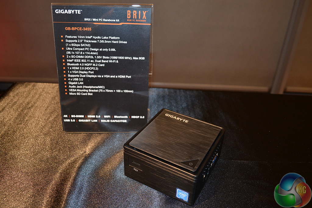 Gigabyte’s BRIX systems were on display. There was a ‘conventional’ small BRIX featuring Intel’s Apollo Lake platform. The low-end BRIX models have proven popular with buyers thanks to their ability to run basic office and HTPC tasks with a very small footprint.