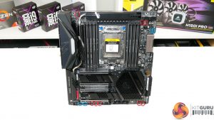 Vertical positioning of the CPU socket and DIMM slots means that the first PCIe slot location is infringed upon. The benefit of this design decision is that it allows Gigabyte to provision more space above the CPU socket for the VRM components and cooling.