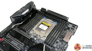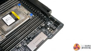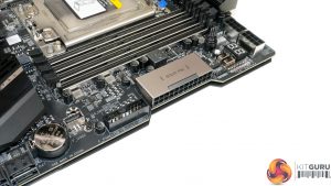 As is the norm for TRX40 motherboards, eight DDR4 DIMM slots are positioned either side of the giant sTRX4 CPU socket. Gigabyte quotes support for non-ECC memory up to 256GB using currently available 32GB DIMMs. ECC memory support is also stated, with Gigabyte’s QVL outlining compatibility with some Crucial (Micron) and V-Color (SK Hynix) modules.