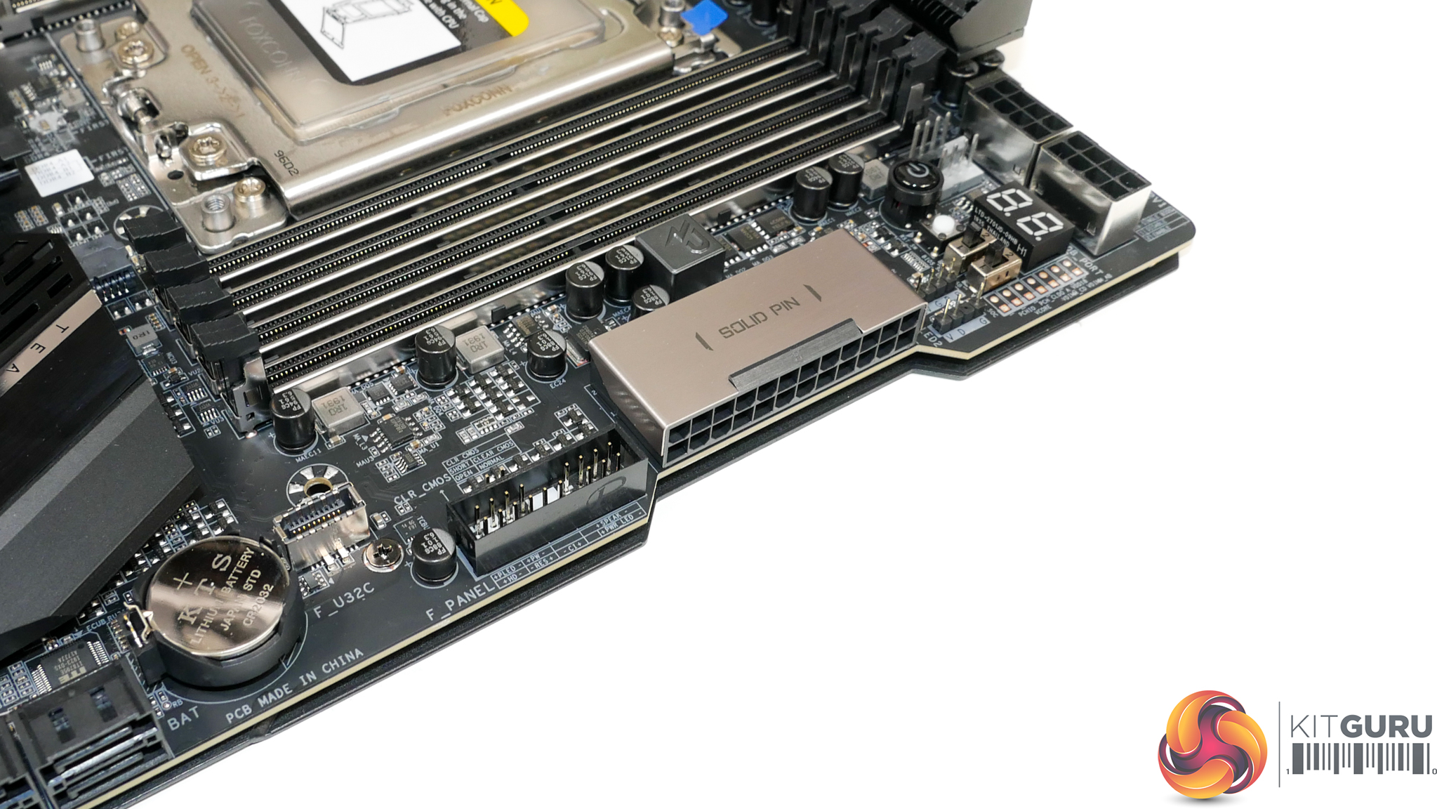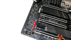 Moving further down the motherboard’s right edge, we come across the right-angled 24-pin connector. This 90-degree rotated orientation is undeniably clever when it comes to cable management benefits. But on an already-very-wide E-ATX motherboard, it will certainly increase the odds of installation woes in many mid-tower and even full-tower cases. This issue is somewhat alleviated by Gigabyte’s use of a small PCB cut-out to gives users a little extra space.