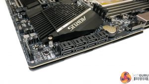 The vertical facing USB 3.2 Gen 2 internal Type-C header is found in its usual location, though Gigabyte could have made more effort to put this flush with the motherboard’s edge.