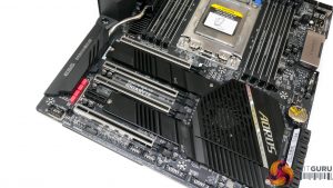 Three M.2 slots are spread across two primary installation zones on the TRX40 Master. Installation is simple and quick – you do not need to remove large motherboard shrouds or heatsinks integrated with the chipset cooler.