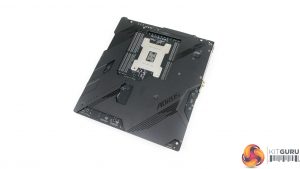 A dark black aluminium backplate encompasses most of the motherboard’s rear side. This rear brace certainly adds structural rigidity to the motherboard, and that is useful when installing a heavy CPU cooler and multiple graphics cards.
