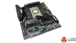 The top slot runs from the CPU and can take 60/80/110mm length drives with PCIe 4.0 x4 or SATA 6Gbps connections. The lower-left slot is exactly the same, other than its size limitation of 80mm drives only. The lower-right option can also take 80mm PCIe 4.0 x4 or SATA 6Gbps SSDs but this bandwidth is fed through the TRX40 chipset.