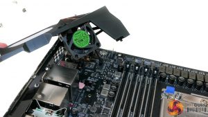 The 55mm diameter chipset fan sits beneath a metal grille and features vertical blades that aim to force airflow in a specific direction. According to our testing, the maximum speed of this fan is around 4200 RPM, at which point it becomes clearly audible and intrusive.