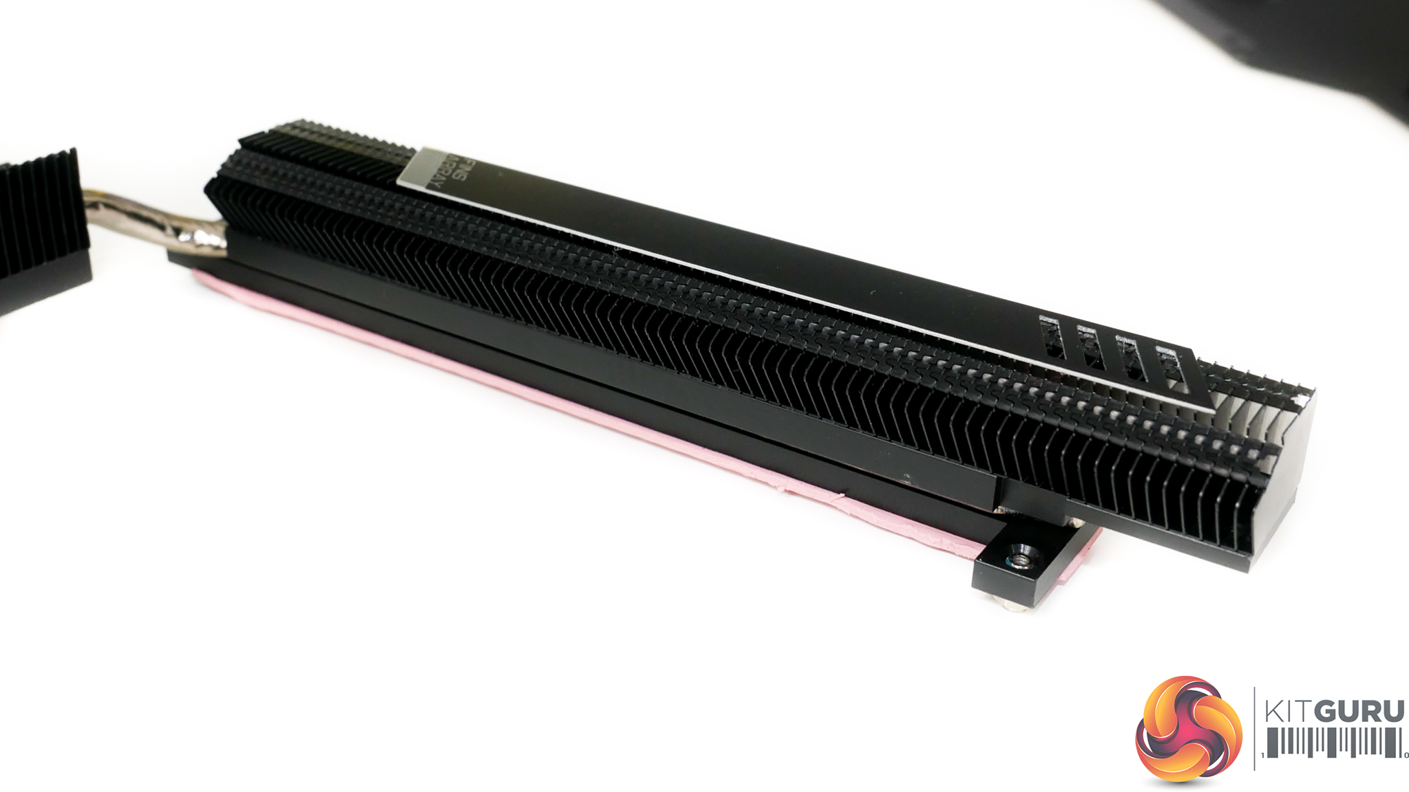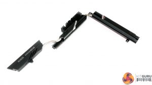The primary MOSFET heatsink is mounted on the top side of the configuration and is connected via heatpipe to the secondary heatsink and the thermal block that stretches down to the motherboard’s bottom-left region.