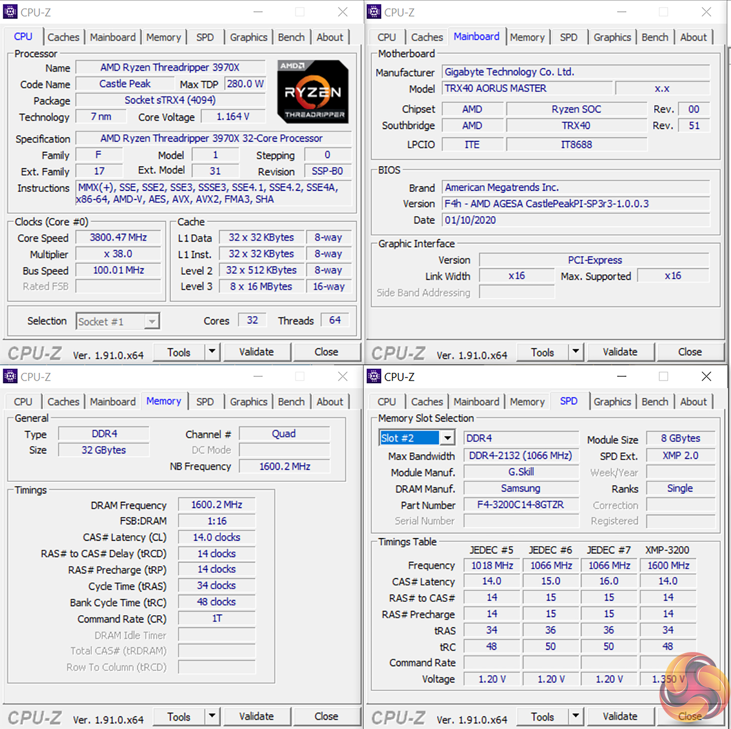 - Gigabyte TRX40 Aorus Master BIOS F4h [AGESA 1.0.0.3] (latest at the time of testing).