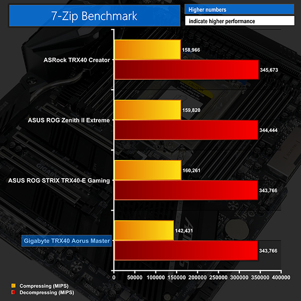 Gigabyte TRX40 Aorus Master is as fast as competitors in terms of 7-Zip’s decompressing numbers, but it is noticeably slower on the compressing front. This is an early indicator that system memory bandwidth is reduced versus that competing solutions as it is a critical factor in 7-Zip’s performance.