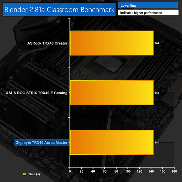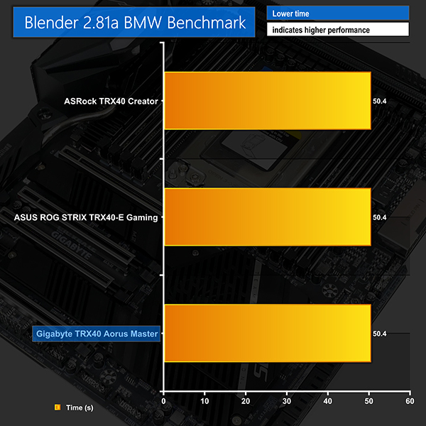 Blender also showed perfectly competent performance from the Gigabyte motherboard with its results matching those of ASUS and ASRock competitors. All-core frequencies in Blender hovered around 3825MHz on average.