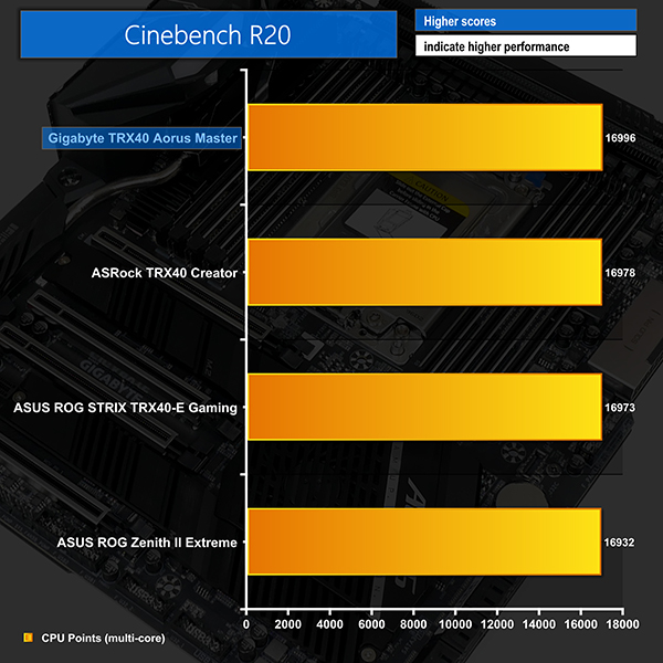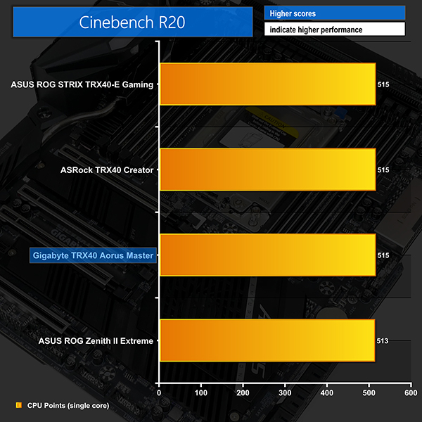 CPU performance from the Gigabyte TRX40 Aorus Master was as good as competing TRX40 motherboards, if not a little faster (albeit with very minor victories). All-core frequencies were around 3.875GHz in Cinebench R20 nT while the single-threaded test confirmed that the maximum boost clocks of 4.5GHz were being achieved.
