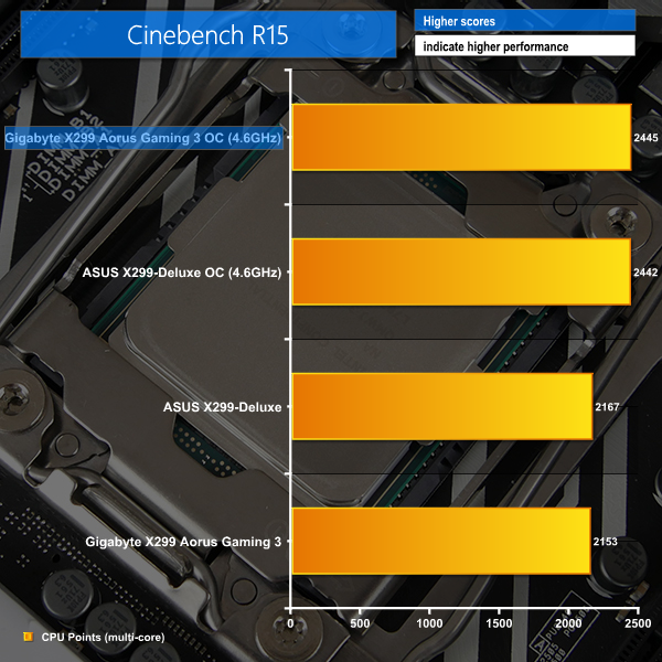 As a performance comparison, we have included the results from the ASUS X299-Deluxe. The maximum overclocked configuration achieved with each board was a 4600MHz (46 x 100MHz) processor frequency whilst using 3200MHz CL14 memory.
