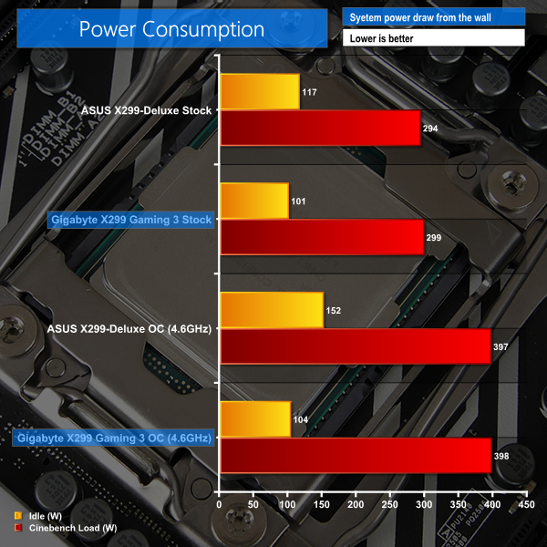Gigabyte's idle power consumption is superb thanks to the board's proficiency at dropping clock speeds and voltages under low load. Load numbers are also fair for a lower-cost X299 board and prove that the International Rectifiers-based VRM was a smart choice.