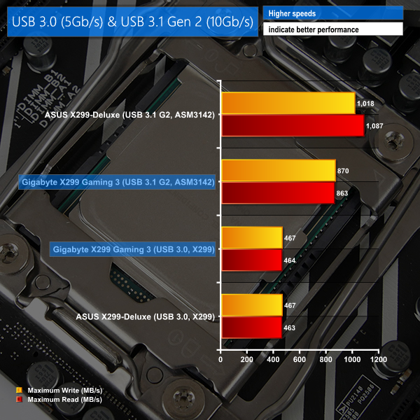 USB 3.0 5Gbps performance is right where it should be, which is unsurprising given the use of X299-based connections.