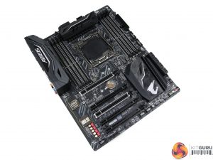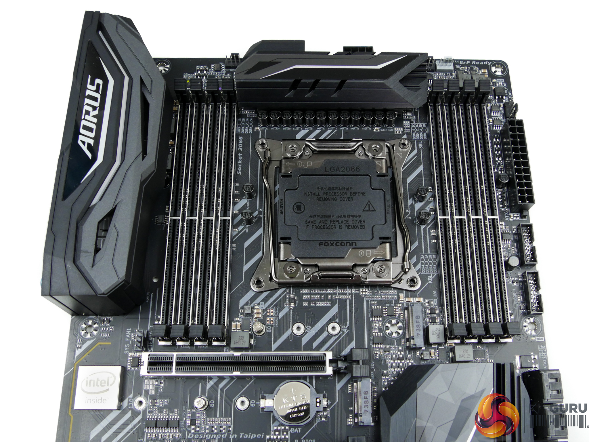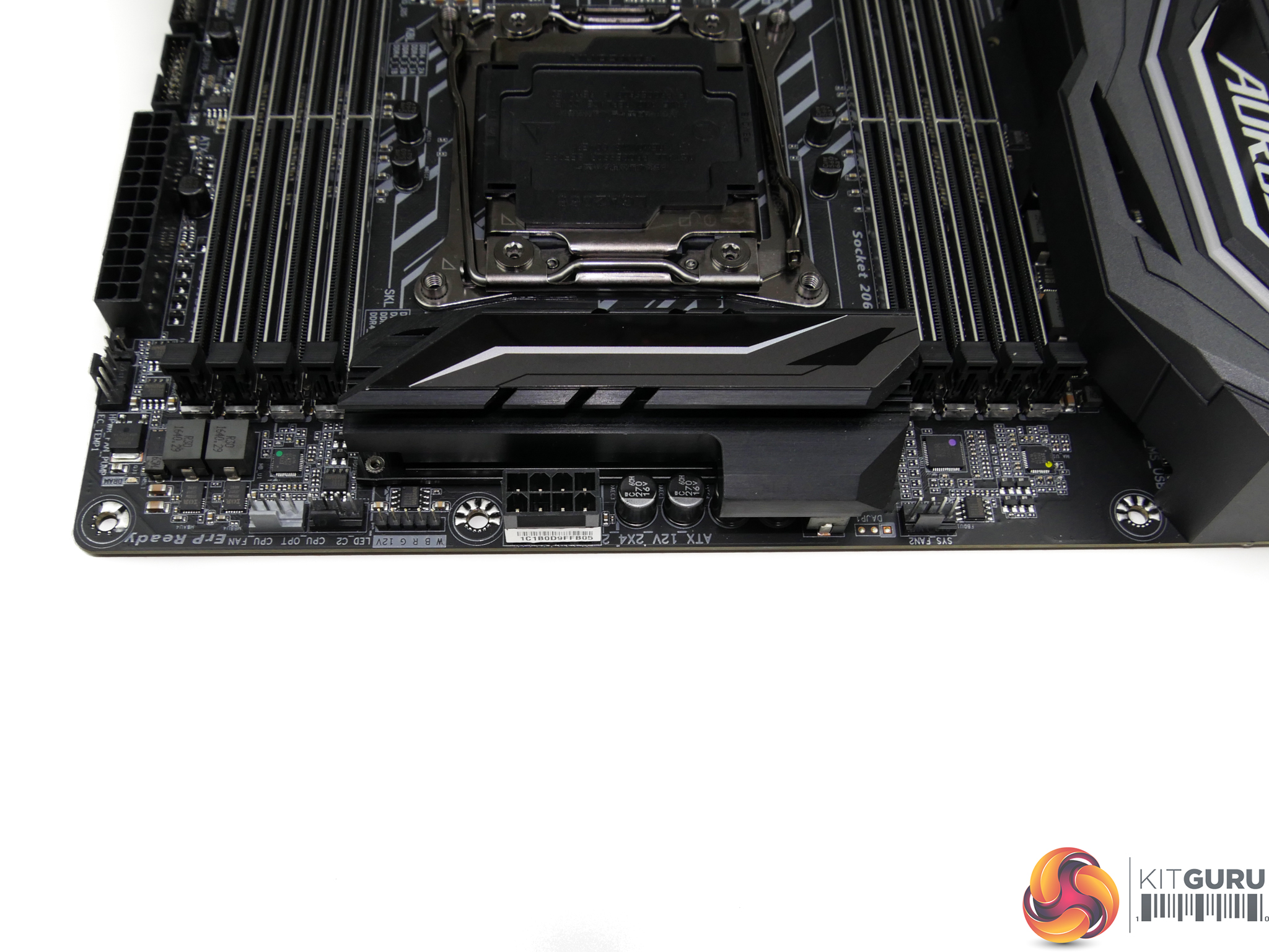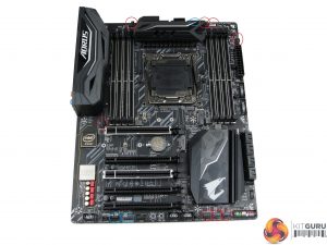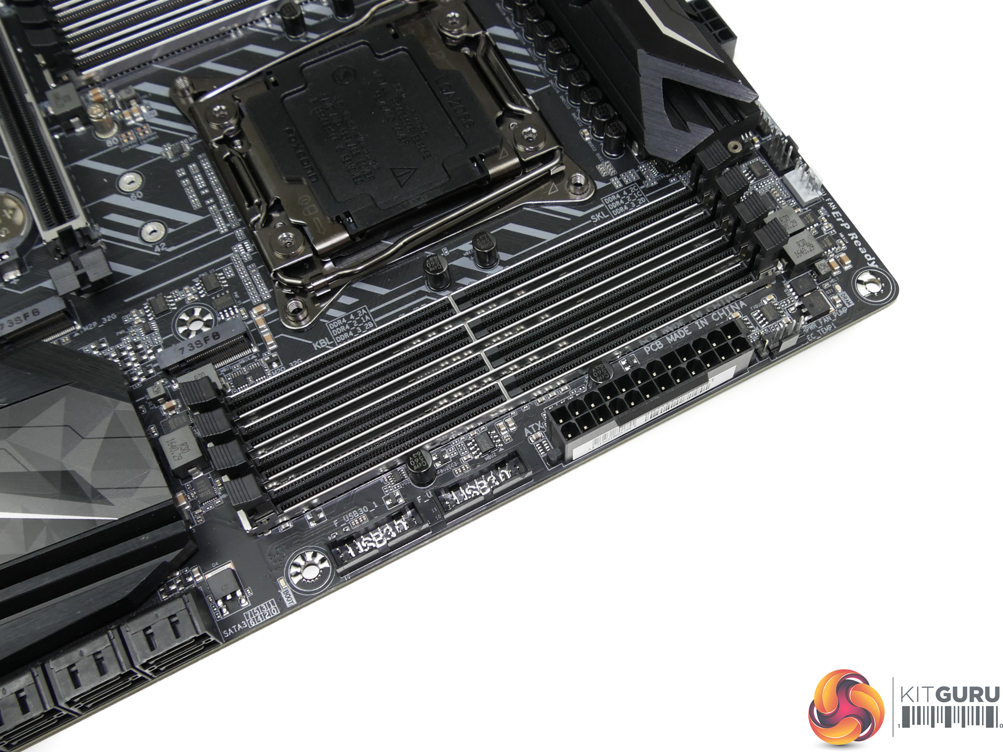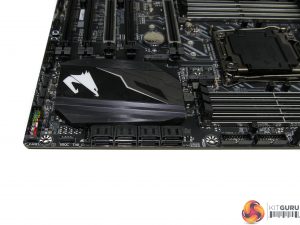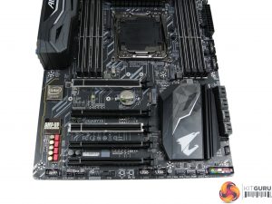 Four DIMM slots are positioned either side of the LGA 2066 socket, making this motherboard quad-channel memory capable with a Skylake-X CPU. Gigabyte conveniently highlights which slots should be used with a Kaby Lake-X CPU and its dual-channel memory support.
