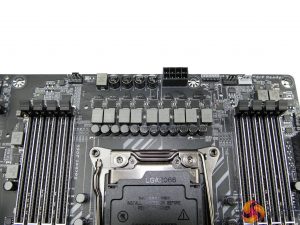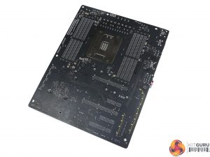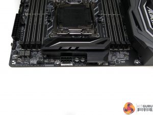 Eight International Rectifiers IR3556M MOSFET solutions are tasked with CPU power delivery duties (that additional IR3553M phase is likely to feed supplementary components). The 50A-rated Integrated PowIRstage solutions are well-respected in the industry and will be perfectly capable of powering even overclocked Skylake-X CPUs (provided they can be cooled adequately).