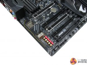 Gigabyte deploys five full-length PCIe slots spread across a six-deep span. The pair of ‘Dual Armor’ metal-reinforced slots are the primary slots that both receive up to 16 Gen 3 lanes from the CPU. The bottom full-length slot is the other high-bandwidth link, receiving up to 8 lanes from a 44-lane chip.