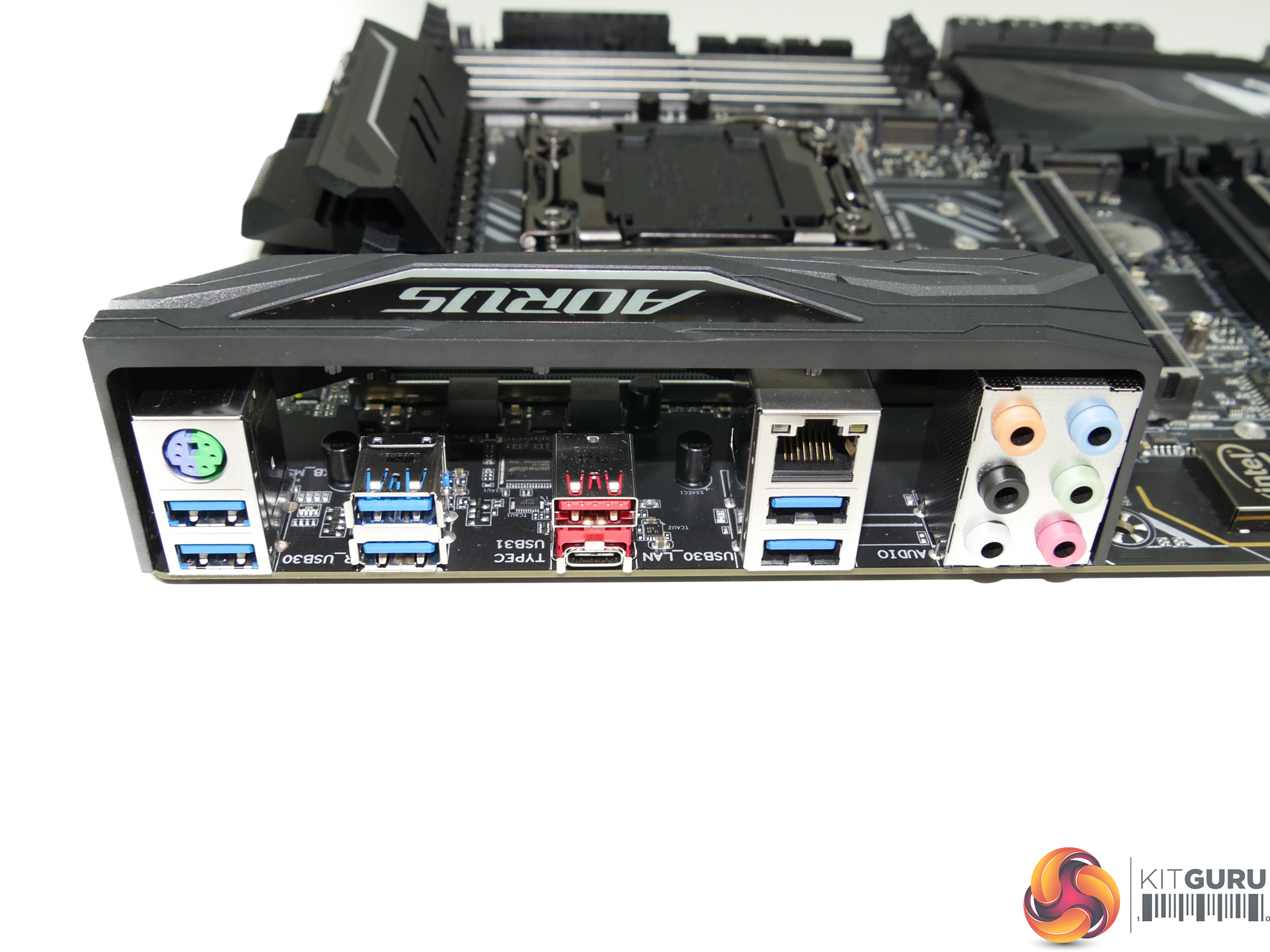 USB ports steal the show on the relatively bare rear IO. Gigabyte deploys six USB 3.0 5Gbps Type-A ports, all of which operate from the X299 chipset. USB 3.1 Gen 2 10Gbps is provided in Type-A and Type-C form using an ASMedia ASM3142 chipset.