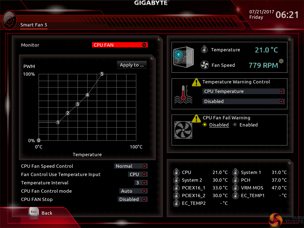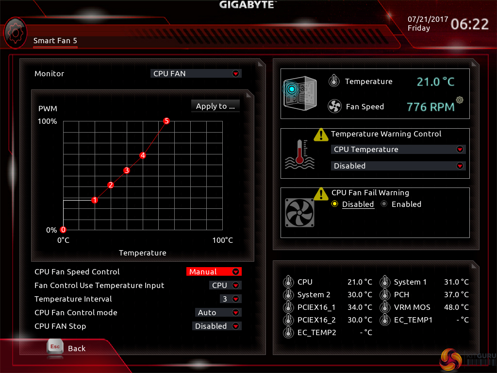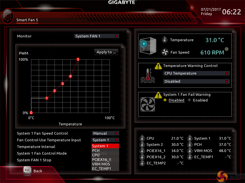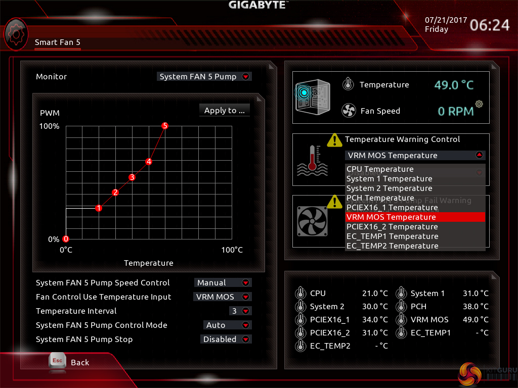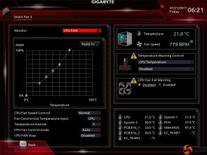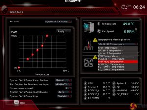 All fan headers can be individually selected and their speed profiles can be tweaked. Gigabyte includes several preset fan speed control settings and a choice of temperature monitoring points. The headers can also be set to PWM or Voltage (DC) mode at will, which is ideal for feeding continuous current to a watercooling pump or letting PWM fans adjust their own speed.