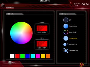 RGB Fusion is Gigabyte’s basic UEFI-based LED colour control tool. Colours can be adjusted in real time and the LED activation mode can be set, but that’s about it. There is a limit to how complex the tool can be given its residence inside the UEFI. The OS version has greater functionality.