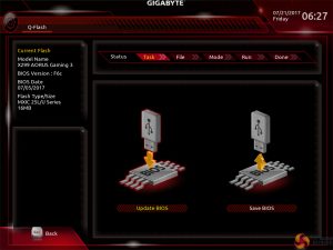 Gigabyte’s BIOS updating tool – Q-Flash – is accessed via a hidden tab on the bottom of the screen. I took a few minutes to find its location which was annoying as it would make more sense if there was some reference to it in one of the main pages, such as BIOS.