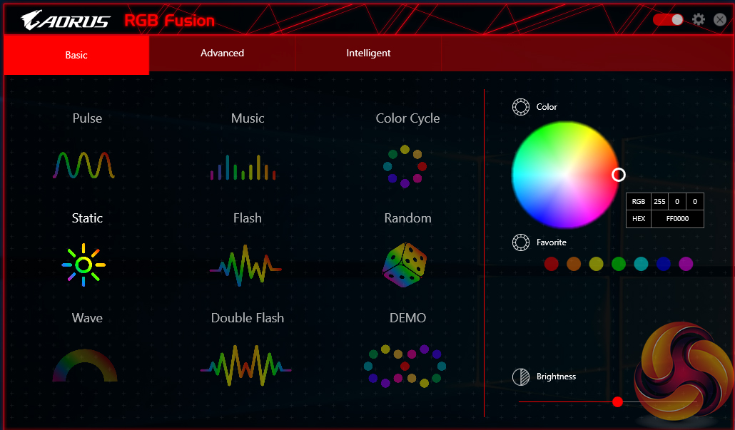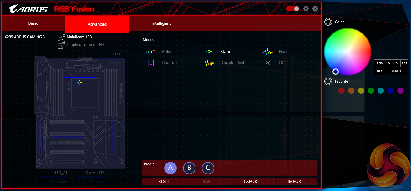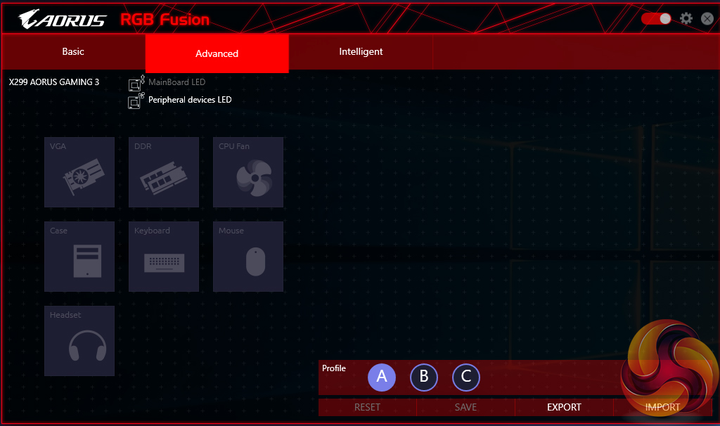 RGB Fusion is Gigabyte’s in-depth LED control application. The Basic tab can be used to activate different LED operation modes and tweak the RGB behaviour. I was particularly fond of the Intelligent mode which adjusts the LED colour profile based on statistics such as the CPU temperature or load, the LAN speed, or even a time schedule.