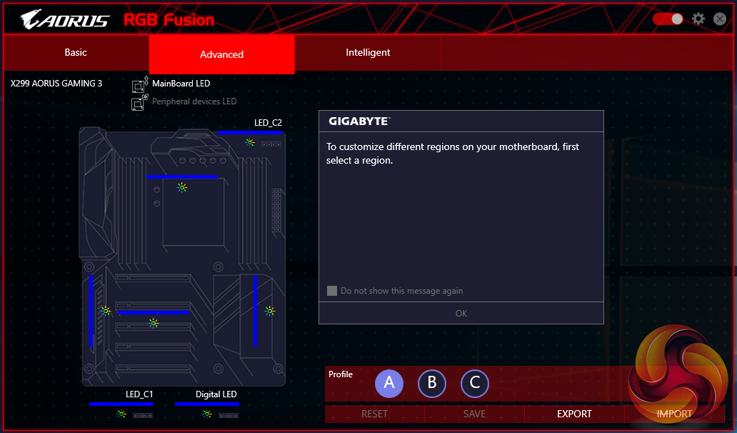 The Advanced section gives more LED control, allowing users to adjust the lighting colour and behaviour for the board’s numerous individual zones (and RGB header). The RGB strips can be set as a different colour to the motherboard. Three individual LED profiles can be saved and they can be exported/imported to share with friends or for backup purposes. RGB Fusion can control the LED profiles of partnering hardware such as an RGB-enabled Aorus graphics card.