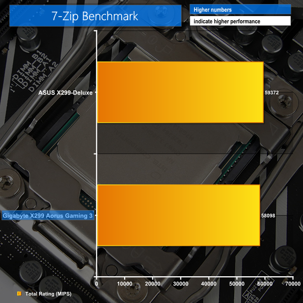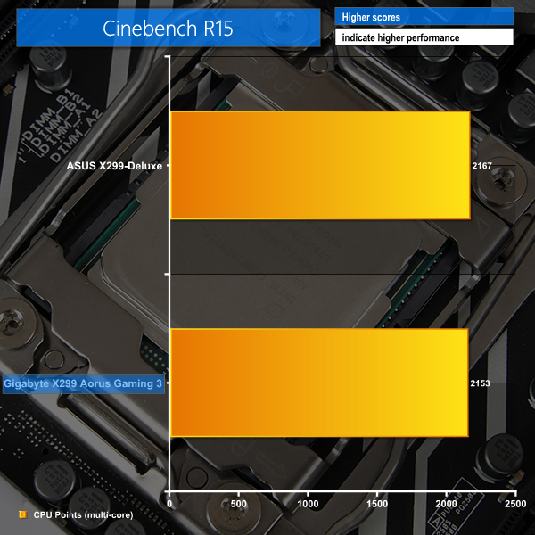 CPU-heavy performance from the Gigabyte board is solid, with the lower cost offering managing to hang with ASUS' expensive X299-Deluxe.