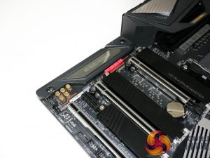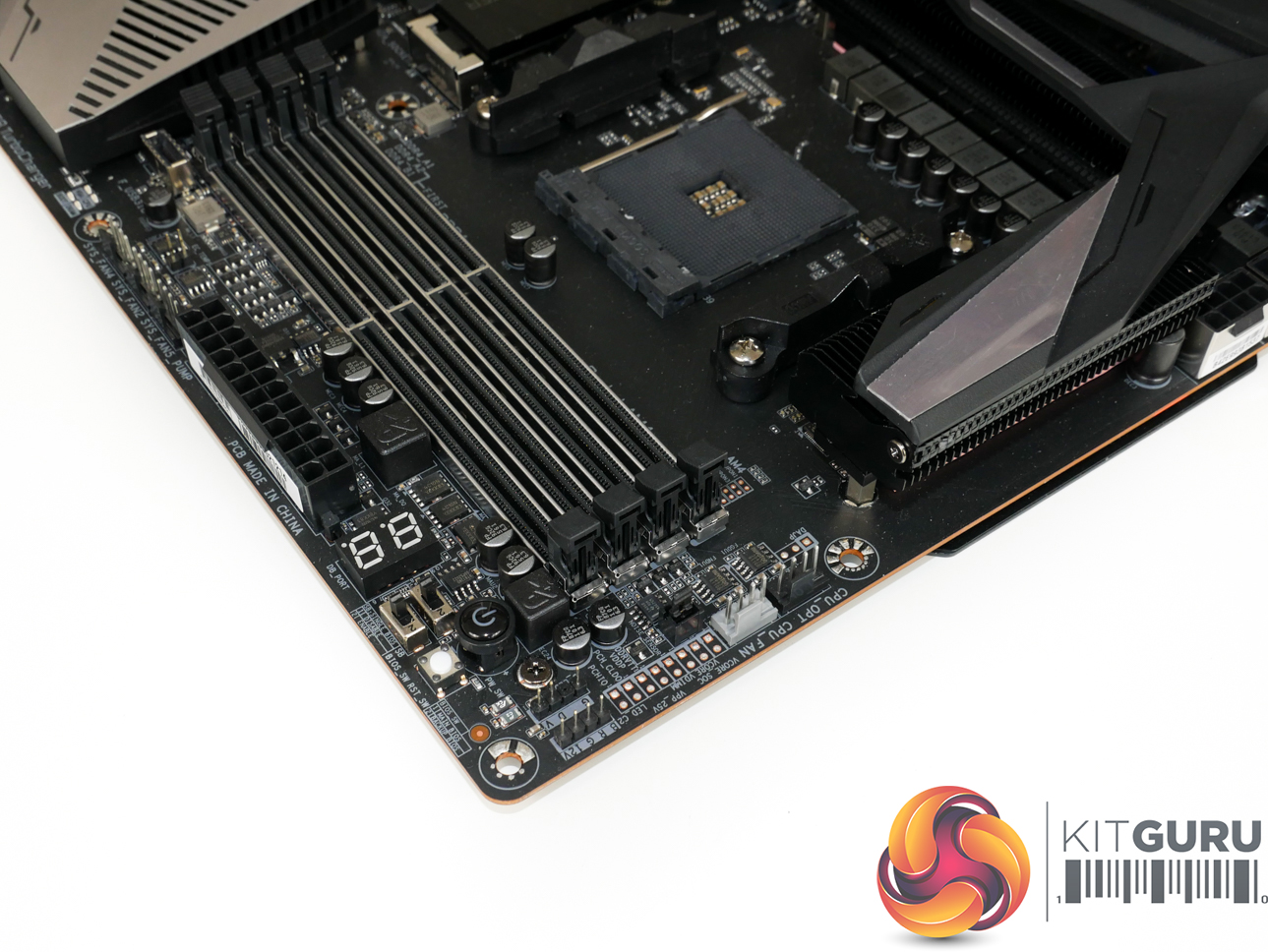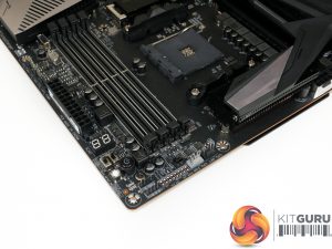 On the memory front, Gigabyte deploys the usual four DIMM slots that each feature strengthened mounting points. The double-latch mechanism is a little more awkward than the single-latch alternative, though that’s a matter of opinion. Up to 128GB of DDR4 memory is supported, when using 32GB DIMMs.